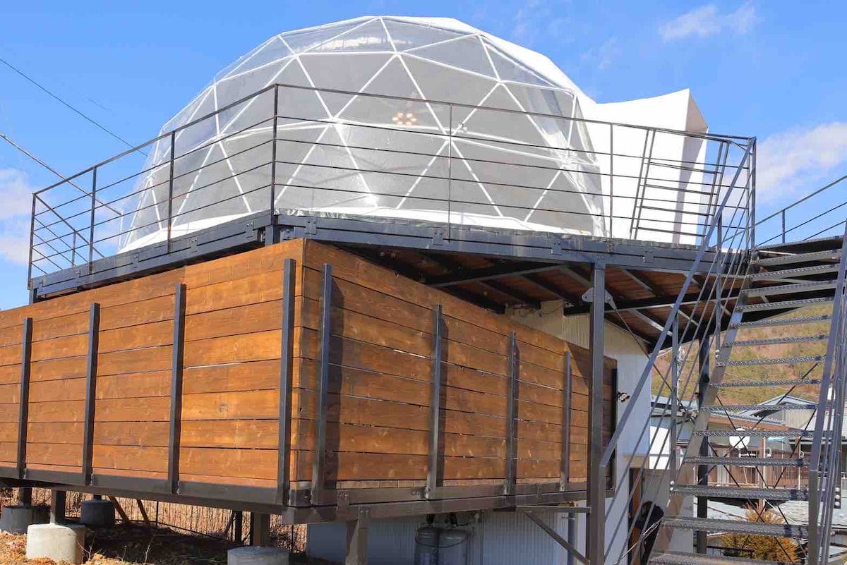 Esta es una cúpula de glamping entera (tienda de campaña con cúpula de 8 m) con vistas al majestuoso Mt.Fuji.Hay un baño con ducha, un baño y un inodoro en la cúpula, para que puedas disfrutar de una estancia cómoda con aire acondicionado y calefacción.Recomendado para viajes en grupo, como parejas, familias y clubes de chicas. A 13 minutos a pie de la estación de■ Shimoyoshida A unos 8-10 minutos en taxi del monte■ Fuji Station, Fuji-Q Highland Station y Kawaguchiko A poca distancia a pie de tiendas de■ conveniencia y farmacias ■Estacionamiento gratuito hasta para 2 autos (no se requiere reservación) ■Hasta 6 huéspedes (gratis para dormir juntos hasta 2 años) ■Wifi gratuito Acceso a destinos turísticos A 8 minutos a pie de la entrada del parque Sengen Shinkurayama y la pagoda Churei/a 19 minutos a pie de la calle comercial con vistas al monte Fuji (Honmachi-dori)/7 minutos en coche a Fuji-Q Highland/7 minutos en coche a Kawaguchiko Ohashi/10 minutos en coche a Fuji-Yama Onsen/18 minutos en coche a Oshinohako/20 minutos en coche al lago Yamanaka [Características] La terraza privada tiene unos 150 m ² y puedes disfrutar de una instalación de barbacoa cubierta, bañera de hidromasaje y sauna de barril sin costo adicional.Las barbacoas de invierno o las bañeras de hidromasaje pueden ser difíciles debido a la nieve o al frío.