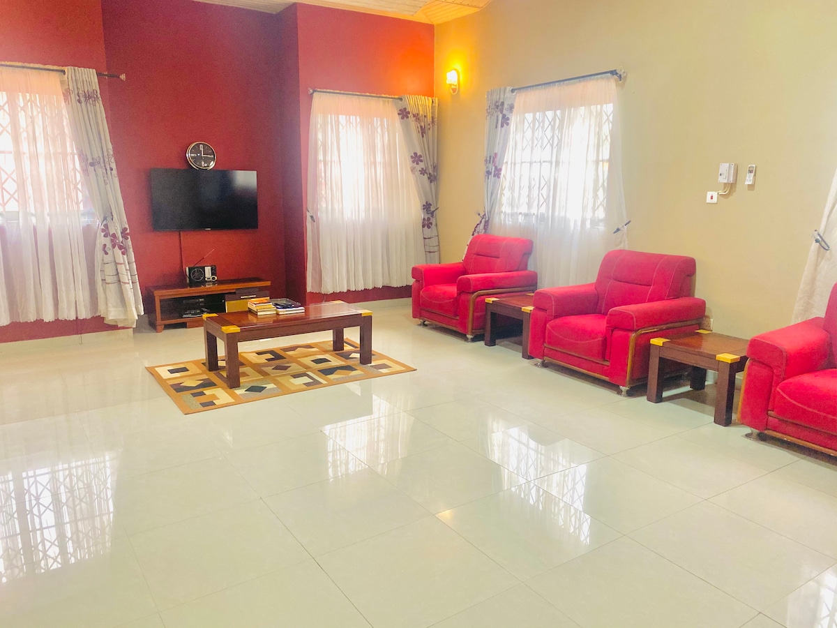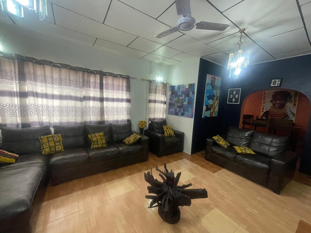 Todo el grupo se sentirá cómodo en este espacio espacioso y único. Viene con 2 dormitorios con calentadores de agua en todos los baños. Muy asequible con suficiente privacidad para apoyar tus actividades en el corazón de Accra. ¡No se comparte nada, ya que todo lo que hay dentro de la casa es tuya! Recogida en el aeropuerto, devolución y conductor disponible para toda tu estancia (muy negociable). Hay un auto disponible si quieres usarlo durante tu estancia.