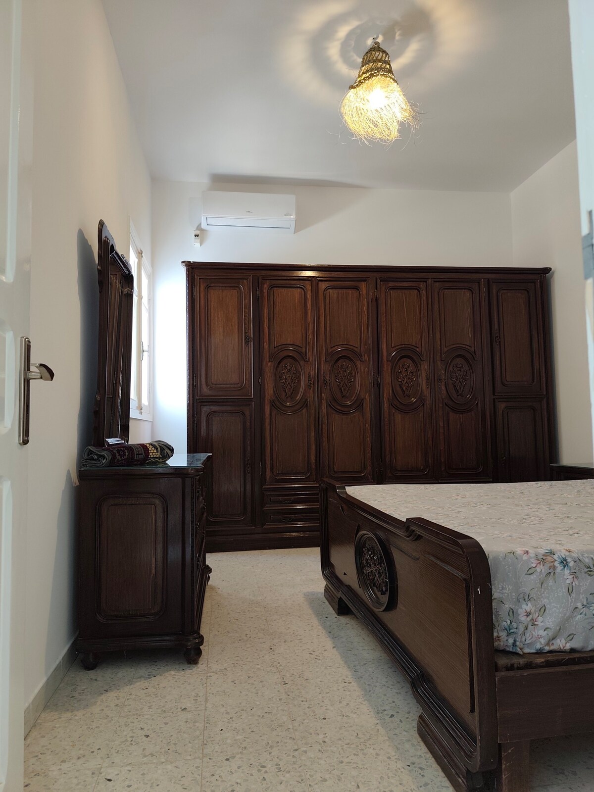 Este tranquilo alojamiento en el segundo piso ofrece un amplio salón con cocina abierta, terraza, dos dormitorios (uno con una cama de matrimonio y armario, el otro con 2 camas individuales y armario -un cuarto de baño con inodoro . Ideal para una pareja o una familia con uno o dos hijos. O posiblemente 3 adultos. Vista al mar, a 1 km de la playa y a 2 km del centro de la ciudad de Gabes . Aire acondicionado wifi cámara vigilancia Contamos con nuestros huéspedes para dejar el lugar limpio.