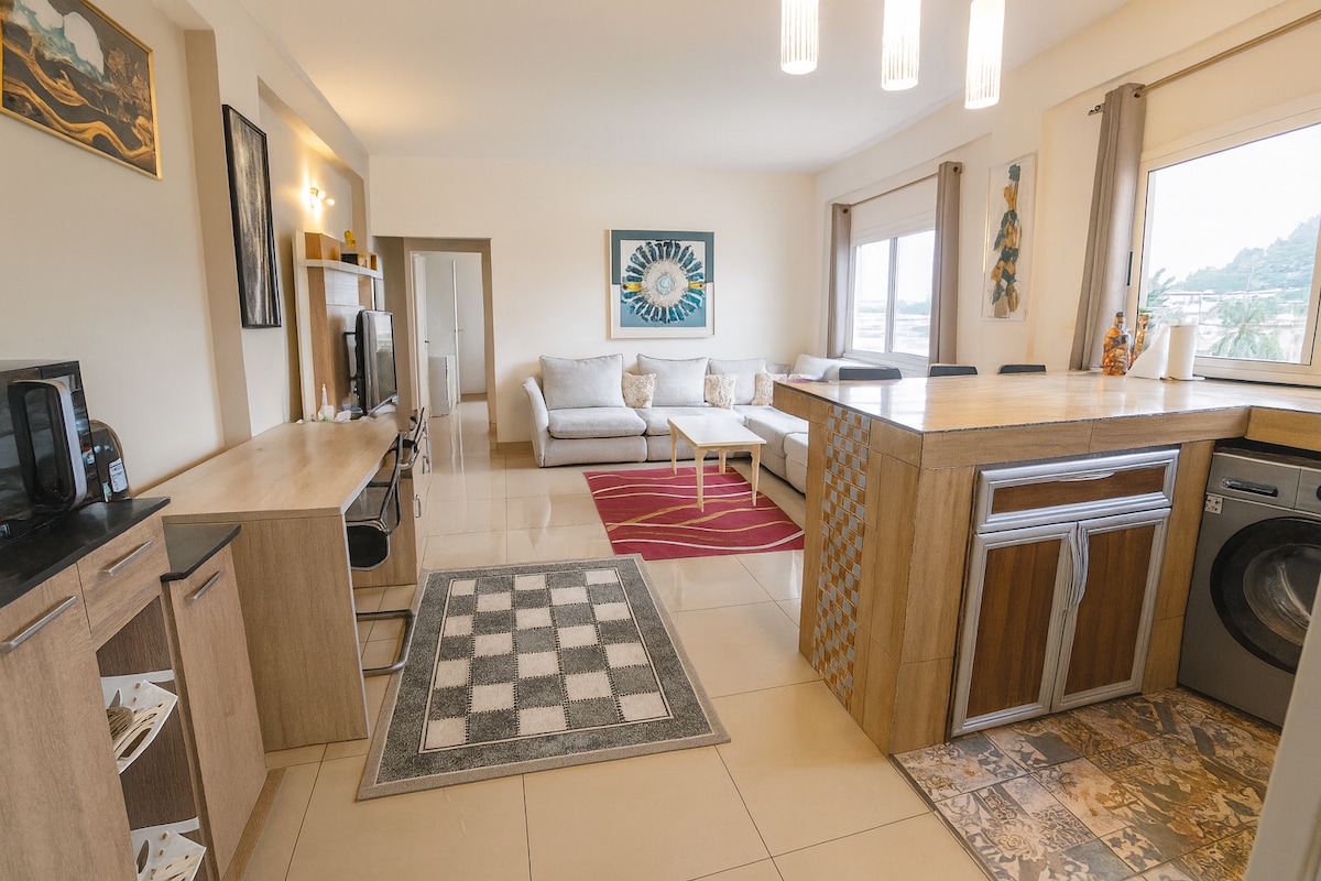 Appartement refait a neuf Intérieur contemporain et cosy Centre ville Idéal pour voyage d'affaire Totalement équipé, ne posez plus que vos valises! A partir d’une nuit. Possibilité longue durée 2 balcons 2 chambres Sur place: Wifi / IP TV / Ménagère / Smart TV Gardien sur place 24H Transfert aéroport sur demande 10 000fcfa de courant offert pour les 1ères nuits. Après c’est à votre charge. **Longue durée: une caution vous sera demandée à votre arrivée et restituée à la sortie des lieux**