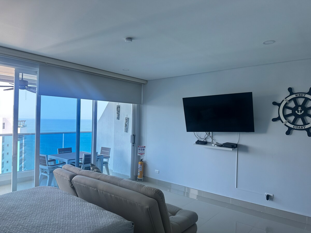 Disfruta de un moderno apartamento en el exclusivo sector de Playa Salguero, ubicado en el piso 17 con espectacular vista al mar. Ideal para parejas o familias. Es un espacio cómodo y relajante. Cuantas con WiFi de alta velocidad Múltiples piscinas para niños y adultos en los pisos 1 y 19. Zona de Jacuzzi, gym, un Coworking, restaurantes y bares . Favor leer las reglas de la casa sobre un pago adicional de las manillas que se hace en recepción ($60.400) para el uso de las zonas comunes.