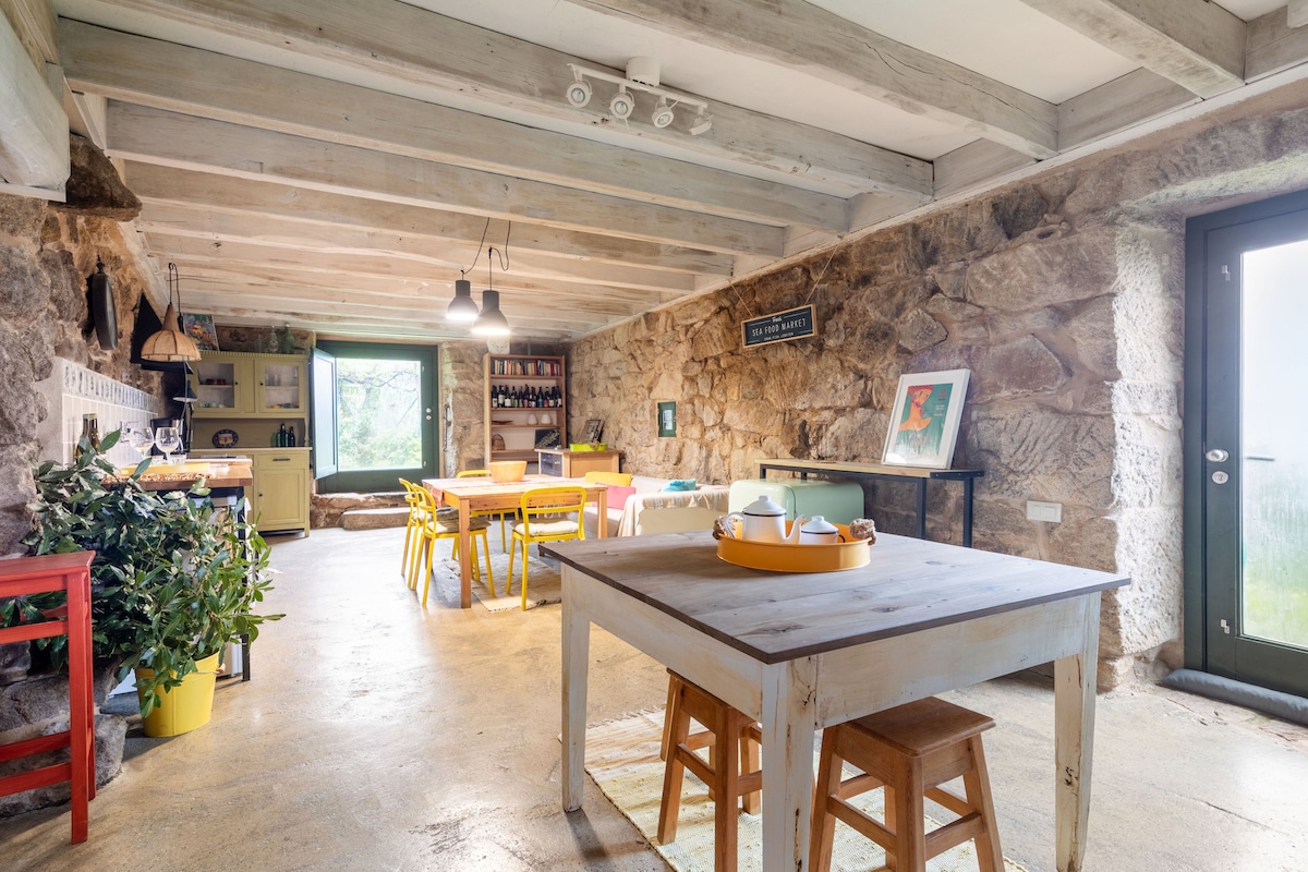 En esta casa vivían los "caseiros" - la familia que cuidaba la finca donde actualmente se cultiva nuestro vino ecológico. Restaurada en 2013, se conservó el espacio de la vieja cocina con su "lareira", el horno y el fregadero de piedra, ahora un espacio fresco para leer, jugar o dormir la siesta. Las dos plantas abiertas miran al valle del río Miño, que nos separa de Portugal. Arriba, para dormir o leer; abajo, donde antiguamente estaban los animales, para cocinar o salir al pequeño jardín.