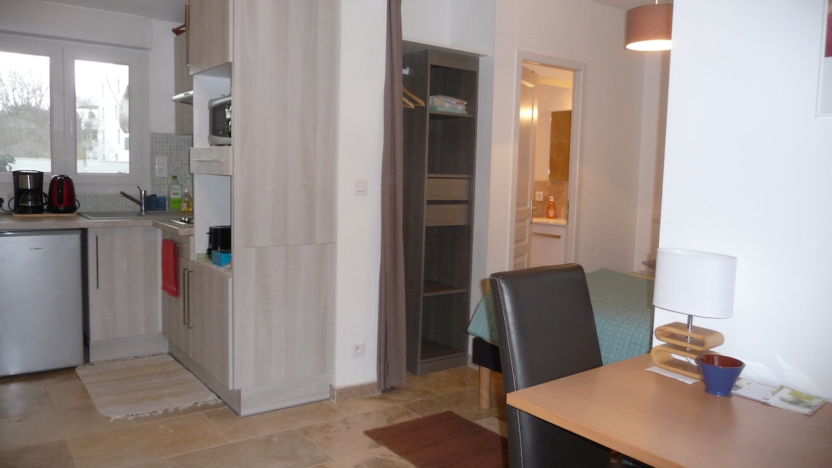 Estudio de 25 m, anexo de una villa pero totalmente independiente. Barrio tranquilo, verde, sin pasar por alto. Dos pequenos jardines y salon de jardin, Bano y sala de bano independientes. Zona de cocina, Plato de enganche vitroceramico, refrigerador, microondas. Calefaccion central. Ropa de cama y toallas proporcionadas. TV y wifi. Estacionamiento gratis. Tiendas y restaurants a proximidad. A 15mn del centro de la ciudad, a 5mn de la estacion de las "Aubes".