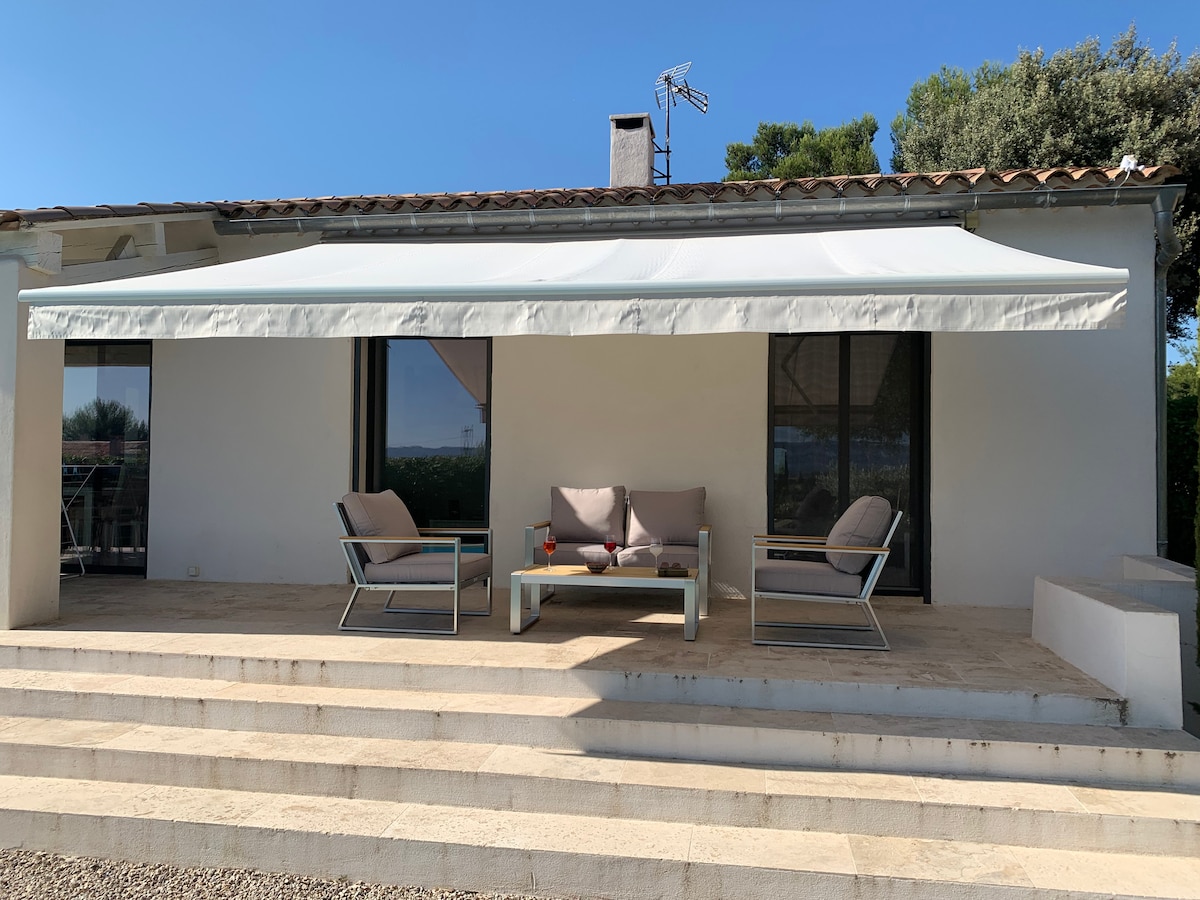 Dependencia de 27 m2, como suite principal al lado de nuestra villa. Piscina compartida con la casa. Entrada privada sin pared adyacente a la villa Una terraza con mesa bajo la pérgola está reservada para usted. ropa de cama a su disposición . No es un estudio, por lo que no hay una cocina real ni fregadero. Sin embargo, el espacio en la parte inferior está equipado con nevera/congelador, microondas, cafetera, tostadora, vajilla. Azúcar, té, cápsulas de café disponibles.
