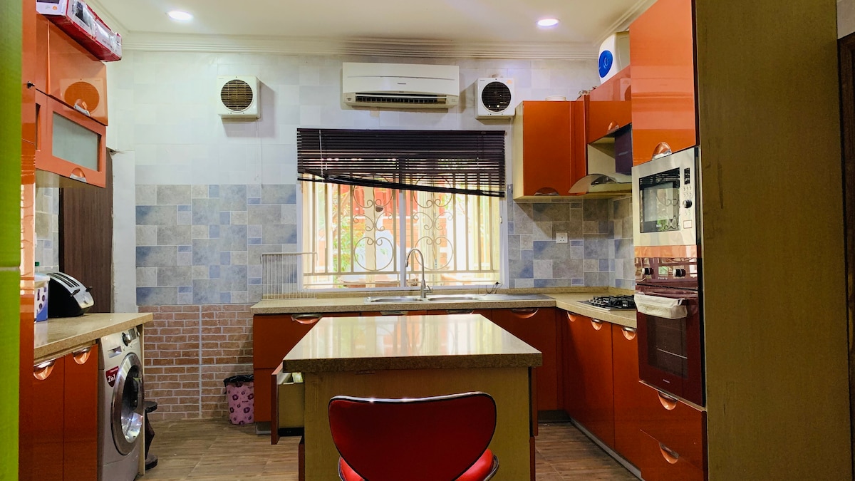 Una casa de 3 dormitorios elegante y masiva + con todas las habitaciones en suite y amueblado con camas y armarios, con dos aseo, calentadores de agua, cocina equipada y totalmente equipada con todos los electrodomésticos de cocina estándar, extractor de humo, amueblado gran salón con comedor ejecutivo, generador de Mikano, perros de seguridad (opcional), amplio espacio de embalaje, flores, cámaras de seguridad, puertas de seguridad automáticas, puertas de seguridad, suelos de madera, buen ambiente, todas las habitaciones equipadas con aire acondicionado