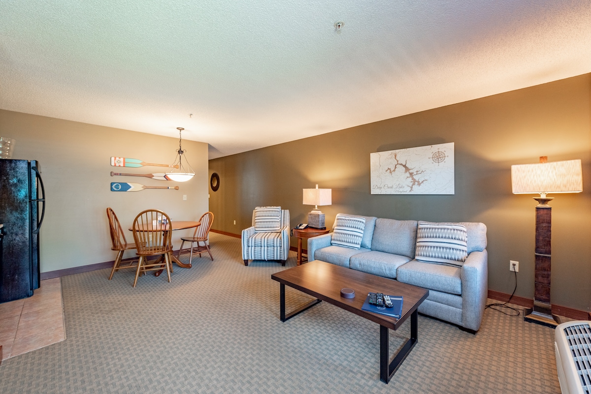 Recientemente renovada y una de las suites más bonitas. Acogedora escapada al lago; 2 zonas de dormitorio separadas. Amplio apartamento tipo loft a orillas del lago Deep Creek. Recién amueblado con cama tamaño king en el dormitorio de la planta baja con armario, cama tamaño queen y sofá en el área del loft, chimenea de propano, cocina americana con microondas y nevera de tamaño completo, Keurig, baño completo en la planta baja, techos abovedados y mucho más. Gimnasio comunitario, sala de juegos y gran terraza al aire libre. Si solo necesitas 1 noche, envíame un mensaje. Por favor, 25 años para alquilar.