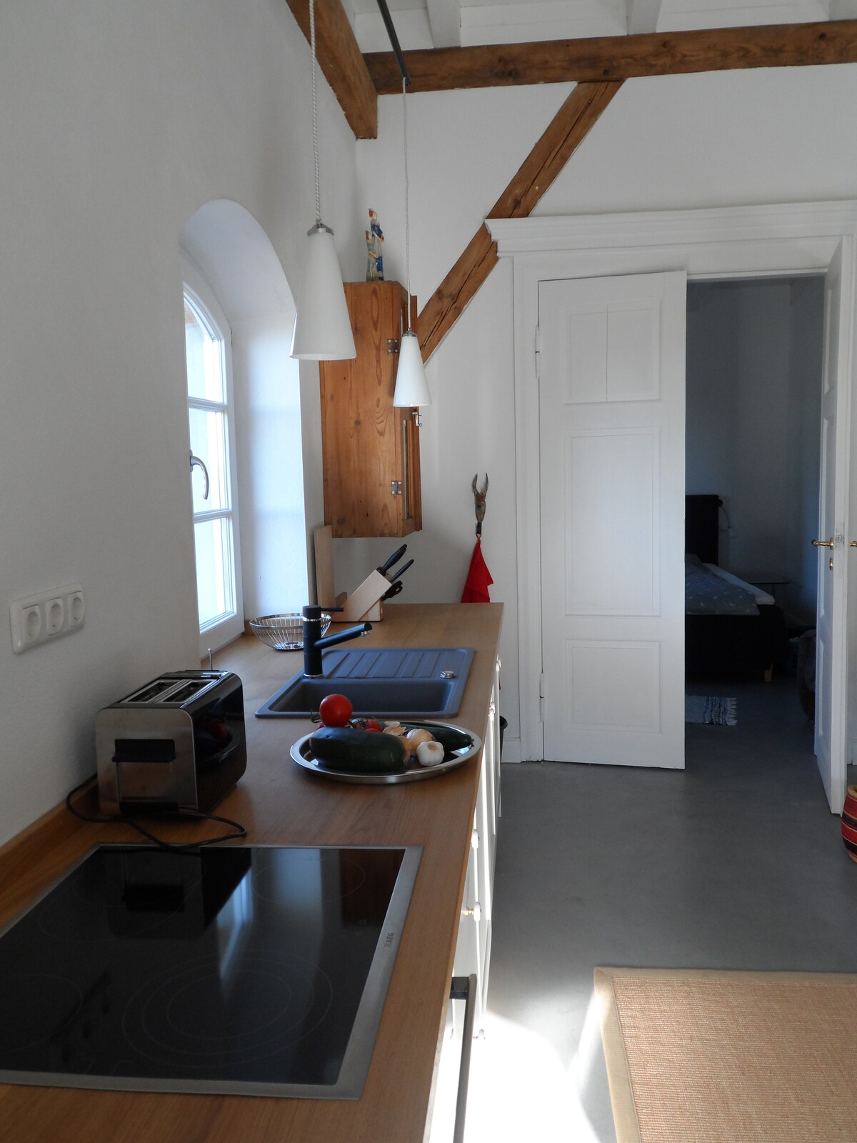 tranquilo pero céntrico A 10 minutos a pie de la playa/puerto a 5 min. a pie del centro salón/dormitorio abierto decorado de forma luminosa y acogedora Cocina americana Calefacción por suelo radiante Cuarto de baño con ducha a ras de suelo y luz natural Televisor LED, reproductor de DVD, wifi