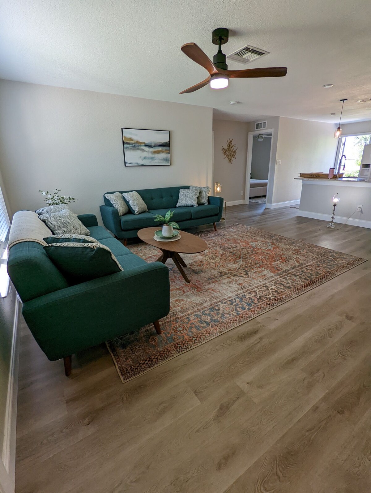 Retrocede en el tiempo a un diseño de interiores moderno de mediados de siglo. Despiértate descansado en un hogar tranquilo, limpio, seguro, espacioso y elegante lejos de casa. Suite principal con moderna cama queen con dosel y fandelier. Cafetería complementaria (keruig y goteo) Cocina/lavavajillas totalmente amueblado. Espacio de trabajo dedicado. El segundo y el tercer dormitorio comparten un baño de azulejos de lujo. Asientos serenos en el patio, lavadora/secadora, garaje. Perfecto para viajeros que trabajan, nómadas digitales y grupos. Precio asequible. Acomoda cómodamente de 1 a 7 personas.