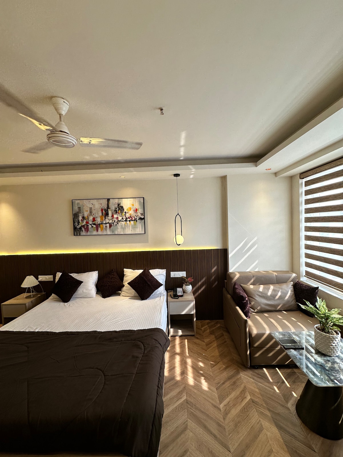 El primer apartamento de 2 Bhk que cumple con todos los requisitos ✨ - 2 dormitorios ( dormitorio principal, segundo dormitorio). - Dos camas tamaño king. - Una amplia sala de estar con una cómoda disposición de asientos. - 2 baños ( 1 en cada uno de los dormitorios). - Cocina pequeña (con todos los utensilios básicos de cocina disponibles y servicios abastecidos, es el lugar perfecto para preparar tus comidas favoritas) - Una zona de balcón compartido que conecta con el apartamento, que puede ser el espacio perfecto para tus paseos nocturnos. ¡Reserva ahora!