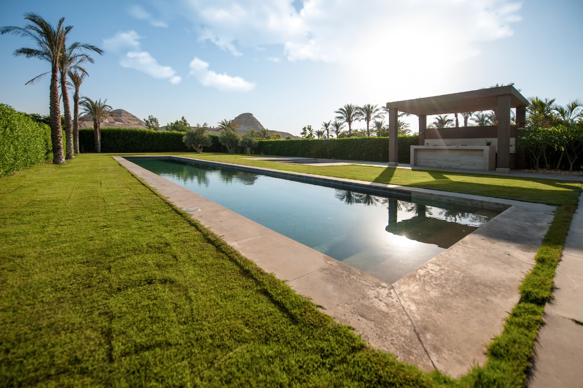 Despiértate con la impresionante vista de las antiguas pirámides de Abusir justo frente a ti. Villa de 5 dormitorios con casa de huéspedes, piscina, jardín, gimnasio, sala de juegos y casa del árbol. Capacidad para 10 personas. Diseñado por el galardonado arquitecto Ahmad Hamid (Premio Mundial de Arquitectura 2010), inspirado en Hassan Fathy. A 20 minutos de las pirámides de Guiza y el Gran Museo Egipcio. Colección de arte seleccionada personalmente por la propietaria Taya Elzayadi. Chef privado disponible para contratar. Un refugio familiar y tranquilo donde se unen la historia, el arte y el lujo.