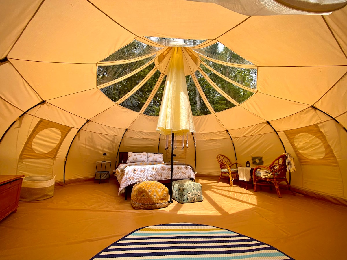 Situada en un prado, nuestra encantadora y acogedora tienda de campaña de 6 m de diámetro está lista para que pases un rato relajante. Equipado con una cómoda cama tamaño queen y un futón plegable, este espacioso alojamiento ofrece comodidad y una experiencia única. Pasa tiempo en la naturaleza en nuestra propiedad de 25 acres o disfruta de una gran cantidad de atracciones, actividades y restaurantes locales. Siéntate junto al fuego, contempla las estrellas, camina por nuestros senderos o juega en nuestros campos. Pregunta por nuestra experiencia de conexión con caballos. Se proporcionan sábanas y edredón.