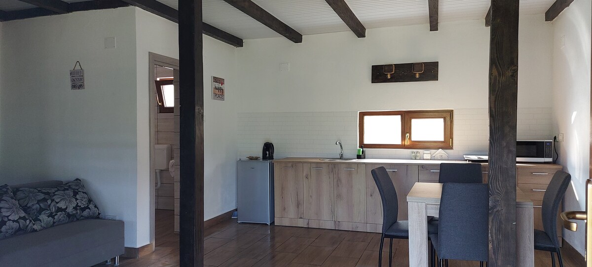 Apartamento de refugio de naturaleza pura. Situado en las estribaciones occidentales de las hermosas montañas Zarand, junto al pueblo de Minis, y a pocos kilómetros de la ciudad de un Arad y a 4 km de la hermosa playa Ghioroc. El apartamento está en la planta baja de una hermosa casa en una propiedad verde. Si también te gustan los animales, te encantará saber que la propiedad también alberga el Santuario APAM, que tiene como objetivo ayudar a los animales abandonados a reparar sus escarras. No organizamos cazadores.