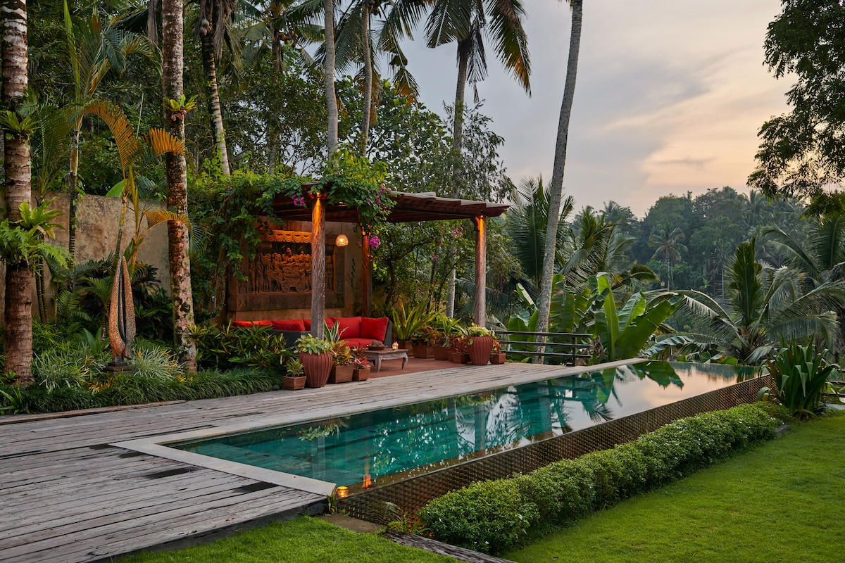 ¡La joya oculta de Ubud! Disfruta de nuestra nueva piscina infinita (mide 10 m x 4 m), que es compartida por tres cabañas en nuestra amplia propiedad, incluida nuestra escuela de cocina. Nuestra cabaña original de Tresna Bali, un tesoro local único que volvimos a montar pieza por pieza en nuestro jardín y agregamos un lujoso baño. Experimentarás la vida del pueblo despertando con gallos bajo intrincadas vigas de madera balinesas. Si prefieres más privacidad y vistas espectaculares, reserva nuestra cabaña Riverview o River Valley View.