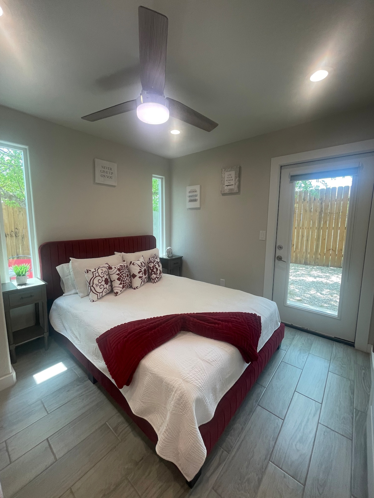 Bienvenido a Cedar Haus, una moderna casa de huéspedes de estilo rancho en Fredericksburg, Texas. - Unidad de 2 dormitorios/2 dormitorios con servicios interiores de lujo. - Múltiples espacios al aire libre para disfrutar de la naturaleza - Dormitorio principal con cama tamaño king y baño adjunto. - Dormitorio adicional con cama tamaño queen y baño adjunto. - Cocina completa con comedor para cuatro personas. - Porche envolvente con mecedoras y fogata de gas. - Pabellón abierto con bañera de hidromasaje y asientos de salón - Acceso wifi gratuito.