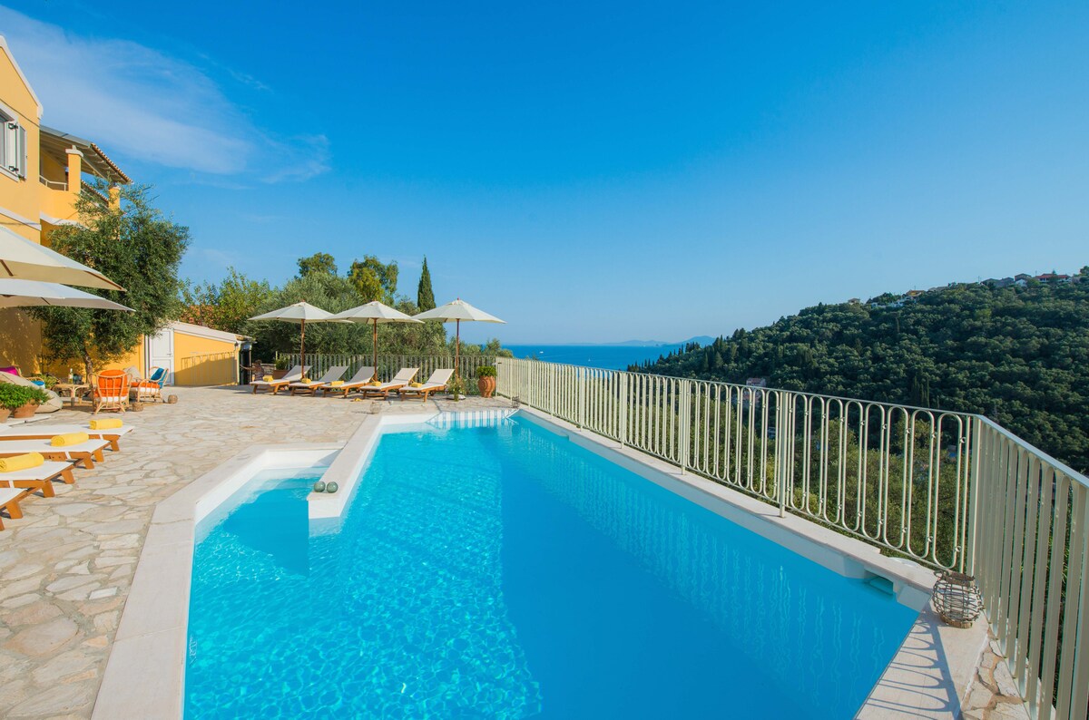 Over 80 ★★★★★ Reviews Villa Genna, a Beautiful villa with pool and amazing views above Kalami & Kouloura picturesque coves. Pleasant & restful place at a very exclusive part of NE Corfu. Amazing Views from every part of the Villa ☙ Heated Pool ☙ Prime Location - 2km away from Durrells Kalami beach ☙ Well-equipped home fast WIFI ☙ Family Friendly layout & gated pool. ☙ Convenient distances from best sites