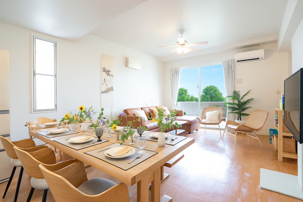 Opened in May 2024, this spacious three-story building is centrally located on Okinawa’s west coast near Route 58. The 113 sqm property is close to conveniences and attractions like supermarkets, parks, and beaches. It accommodates up to eight guests with three double beds, one single bed, and a sofa bed. Features include a fully-equipped kitchen, two toilets, a bathroom with laundry facilities, a large terrace with a barbecue set, free high-speed Wi-Fi, and Netflix. Parking free.