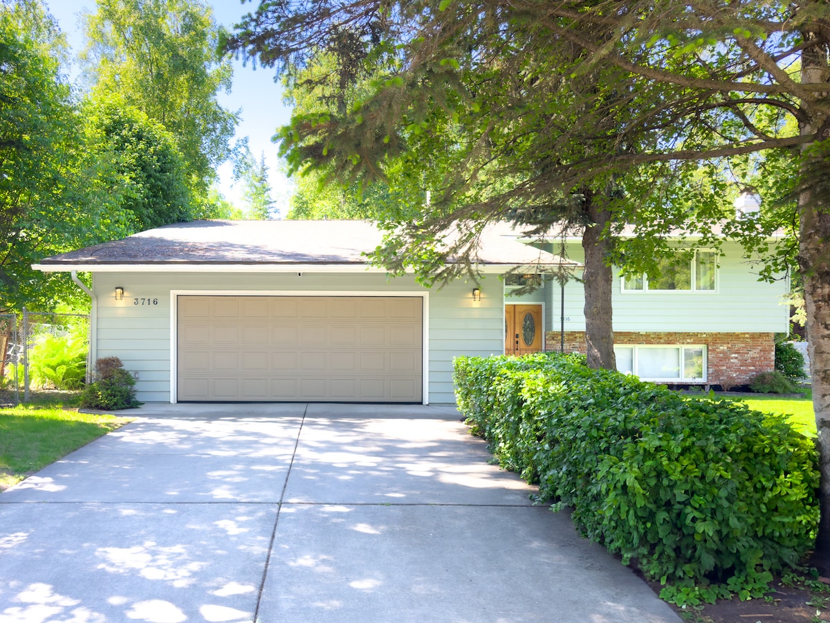 Nuestra casa será una gran adición a tus vacaciones. Ofrecemos una bañera de hidromasaje y sauna. Hay mucho espacio para guardar tu equipo de snowboard o simplemente relajarte. Hay dos baños completos, una sala de estar y una sala de ejercicios en la planta baja. Estamos a 2,5 millas del centro comercial Dimond, a 6,4 millas del centro de la ciudad, a 4,9 millas de Hilltop Ski Hill y a 38,8 millas del centro vacacional de esquí Alyeska. Hay múltiples actividades y restaurantes a menos de 2 millas de la casa.