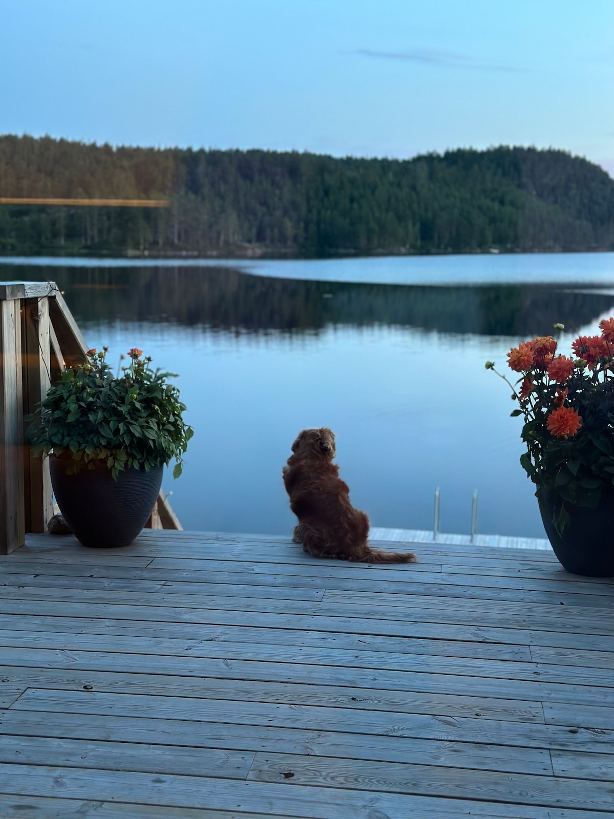 Sjarmerende hytte ved vannet – sol, brygge og ro.