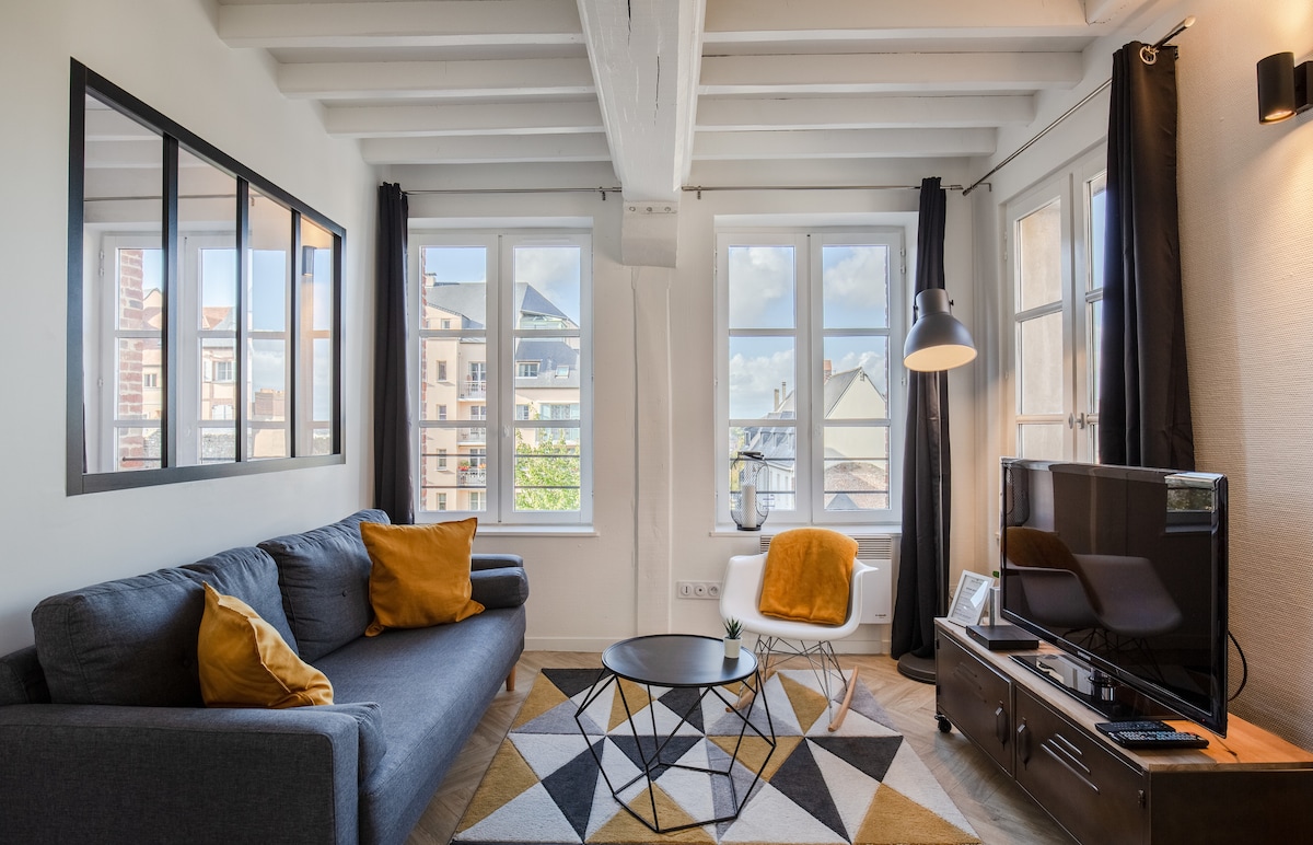 Respetamos todas las nuevas reglas de limpieza relacionadas con la COVID/19. más de 400 comentarios de 5 estrellas para este estudio bañado en calma y luz situado en el barrio de Sainte Catherine, centro histórico, con vistas a la magnífica iglesia con su campanario separado único en Francia. A dos pasos de todos los comercios, restaurantes y museos de la ciudad. Añado que mi estudio está clasificado con tres estrellas por Calvados Tourisme (organismo estatal).