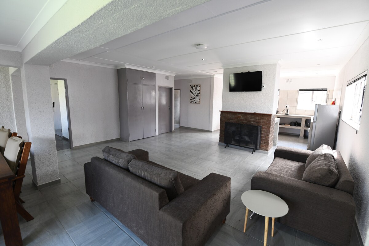 La casa ofrece tres dormitorios modernos en traje, cocina totalmente equipada con sillas de comedor y mesa, sala de estar cálida, área de lavandería, área de braai al aire libre, sistemas de energía de respaldo. Cada dormitorio tiene capacidad para dos huéspedes. La casa tiene capacidad para un total de seis huéspedes. Dos huéspedes pueden reservar toda la casa a un precio reducido Adecuado para una estancia en familia,amigos, vacaciones de negocios y contratistas.