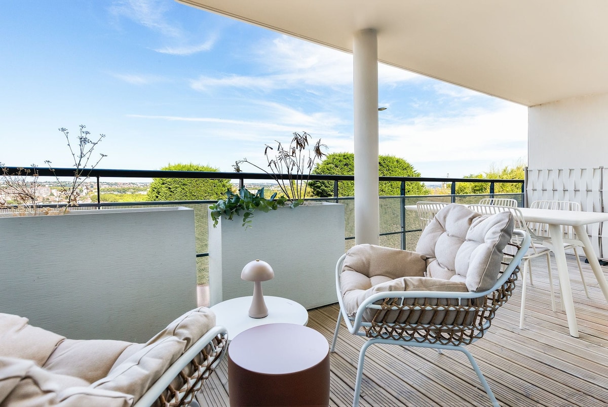 Bright apartment with a private terrace and beautiful views of the hills. Perfect for a peaceful stay just 25 minutes from Toulouse city centre (Carmes district). The pool and garden are shared in a friendly, family atmosphere. Fully equipped kitchen, Wi-Fi, Smart TV and workspace. Access by stairs with handrail (not suitable for wheelchairs).