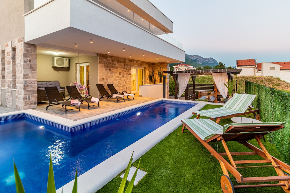 Enjoy a warm, modern 303 m² villa with 4 en-suite king bedrooms, designed for comfort, privacy and calm moments. New construction. Last tasks and images to be done. Still bookable. • Heated saltwater pool • Extra-hot jacuzzi • Sea & mountain views • Fully equipped kitchen + Smart TV • Fast fiber WiFi • Outdoor kitchen, lounge & dining • Quiet area, 1 km to the beach • Near Split & Trogir • Smart self-check-in & quick host support • Perfect for families, couples & friends