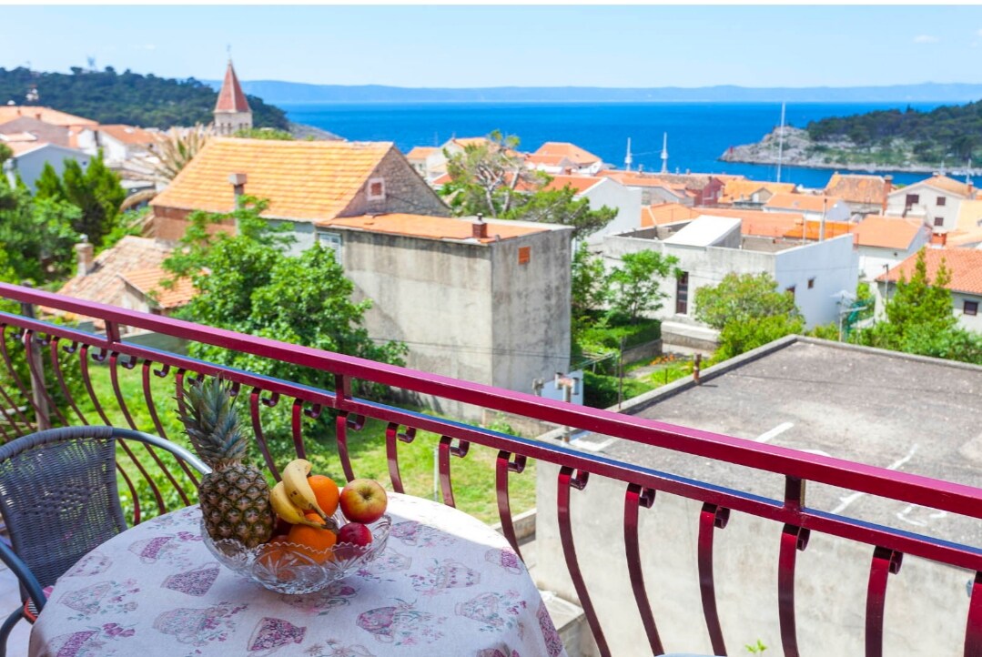It is the apartment - studio 38 m2 on the second floor, which is the room with the french bed , bathroom, large kitchen with eating place, sat tv, wifi, essentials, airconditioning, balcony facing the sea, free parking place . The distance to the old place is 150 meters, to the the sea - lungomare, market, main square, restorants, caffes, discos , church, banks, harbour, markets 200 - 250 meters, bus station 250 meters, the beaches 450 meters, eskursions to islands Brač and Hvar possible.