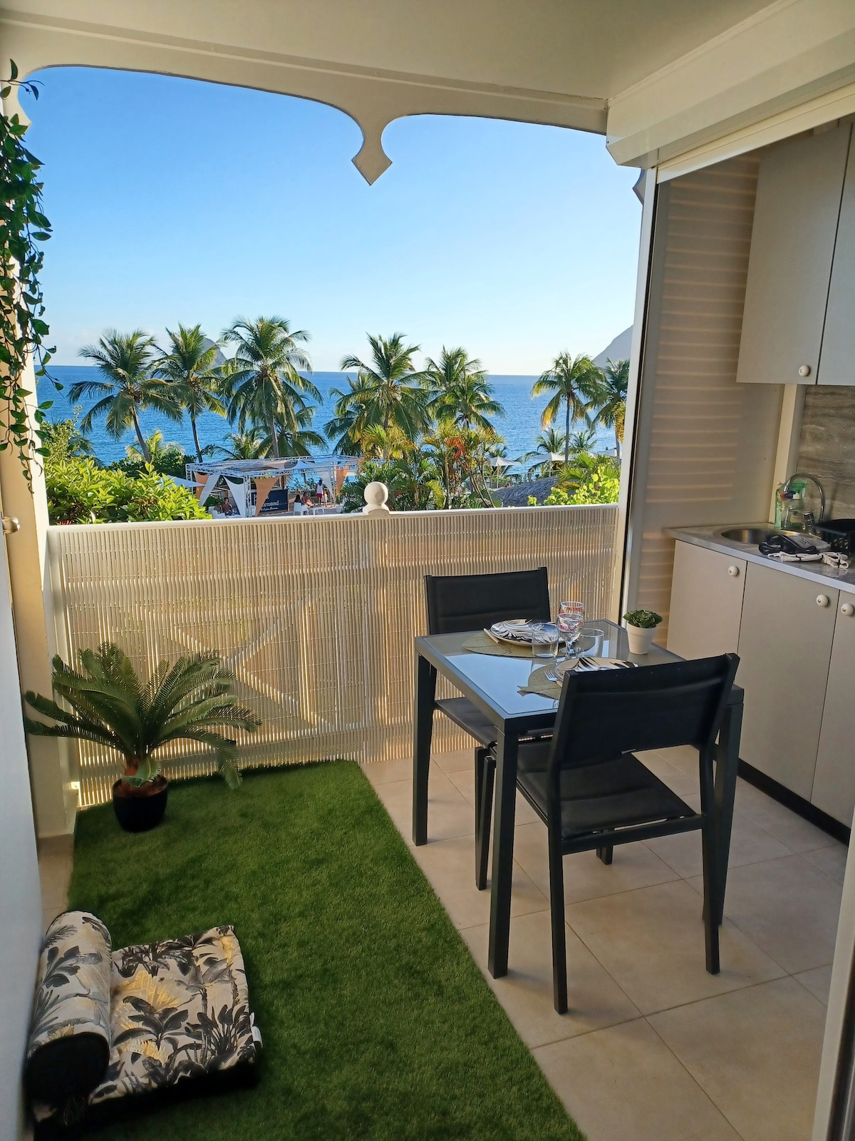 Magnifique studio, idéalement situé dans une villa récente avec environnement calme, verdoyant à proximité de toutes commodités : 200m de la plages, commerces, restaurants et non loin du petit marché bien achalandé de fruits et légumes locaux. Vous apprécierez de prendre vos repas sur la terrasse spacieuse face à la mer, en admirant le Rocher du Diamant, le Morne Larcher et l'île anglophone de Sainte Lucie.