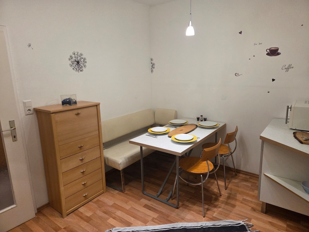 A Garcionerre in the basement of a single-family house in the countryside, surrounded by meadows and forests is available as a quiet accommodation for artistic activities or vacation. The accommodation is ideal for creative work, as the tranquility of nature inspires. The surrounding area offers hiking opportunities and an atmosphere for relaxation. Supermarkets and restaurants can also be reached quickly by car. A bus stop to the city center or Graz is within walking distance.
