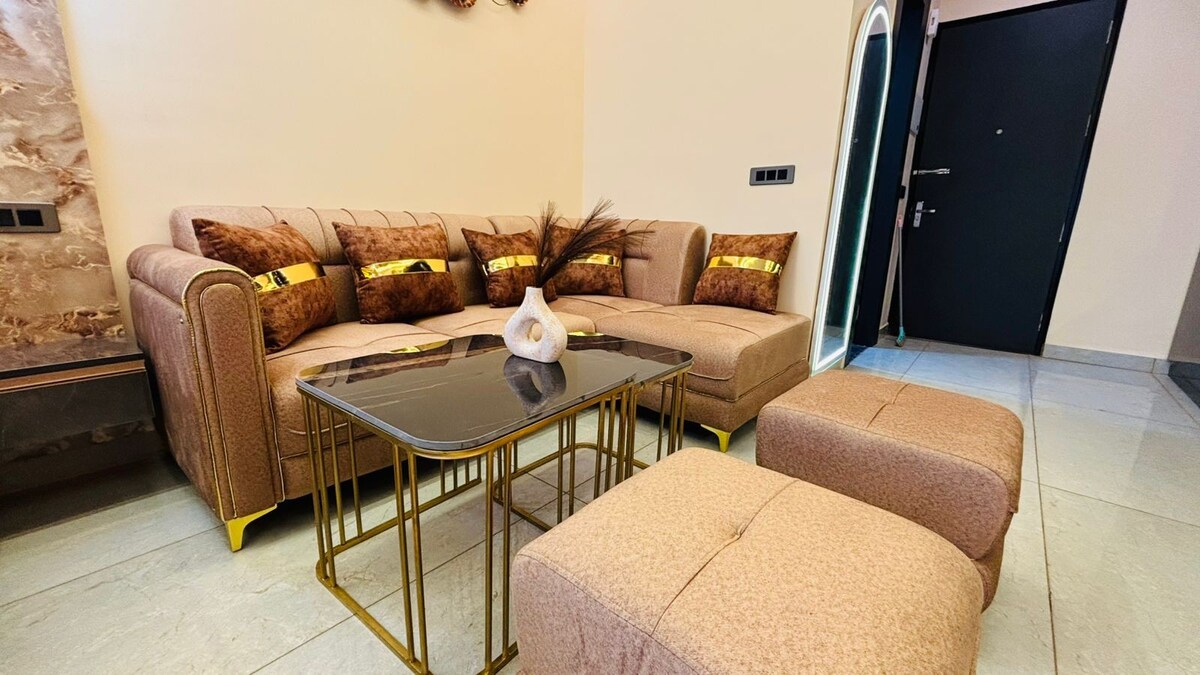 El primer apartamento de 2 Bhk que cumple con todos los requisitos ✨ - 2 dormitorios ( dormitorio principal, segundo dormitorio). - Dos camas tamaño king. - Una amplia sala de estar con una cómoda disposición de asientos. - 2 baños ( 1 en cada uno de los dormitorios). - Cocina pequeña (con todos los utensilios básicos de cocina disponibles y servicios abastecidos, es el lugar perfecto para preparar tus comidas favoritas) - Una zona de balcón compartido que conecta con el apartamento, que puede ser el espacio perfecto para tus paseos nocturnos. ¡Reserva ahora!
