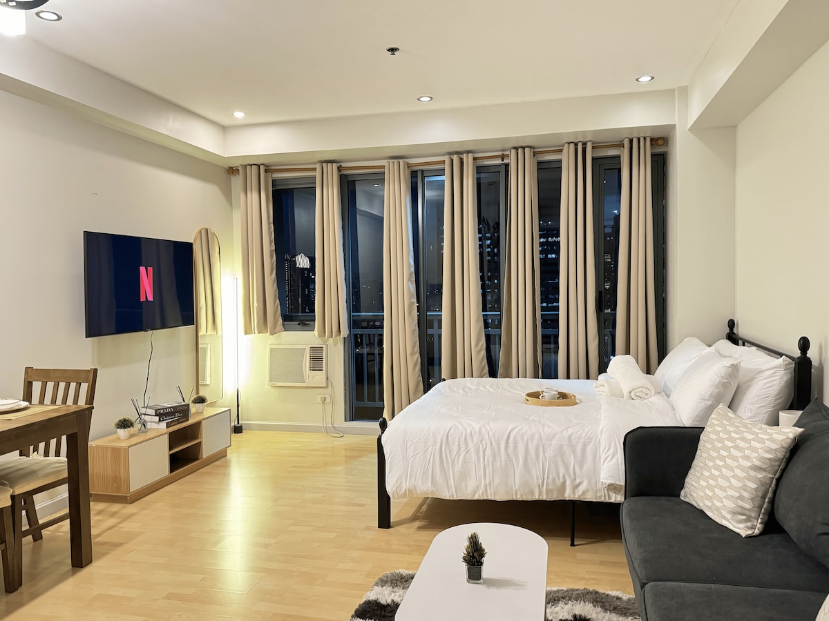 Looking for a fun, cozy, and techy escape? This 24sqm condo in EDSA Mandaluyong is your perfect staycation spot! Enjoy voice-activated smart living, 75” Premium QD Mini LED TV, delivering advanced HDR brightness and stunning picture performance and hotel-like comfort. Sip coffee on the balcony while catching a gorgeous sunset. Stay connected with 100mbps internet—perfect for couples, WFH days, or quick getaways. Stylish, comfy, and packed with cool features—your relaxing city escape starts here!