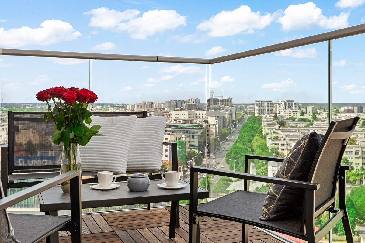 Enjoy your stay in Bucharest at calm in an unique cozy luxurious rooftop apartment with an outstanding view, at walk distance of many restaurants and entertaining places. 10min from airport, 3min from Baneasa Shopping city, 10min from herastrau parc, 12min from Thermes. The apartment is equipped with lux furnitures, 5 stars hotel bed and porcelanosa bathroom. 75m2 terrassa with an incredible sunrise and sunset view, last 8th floor without floor neightboors.