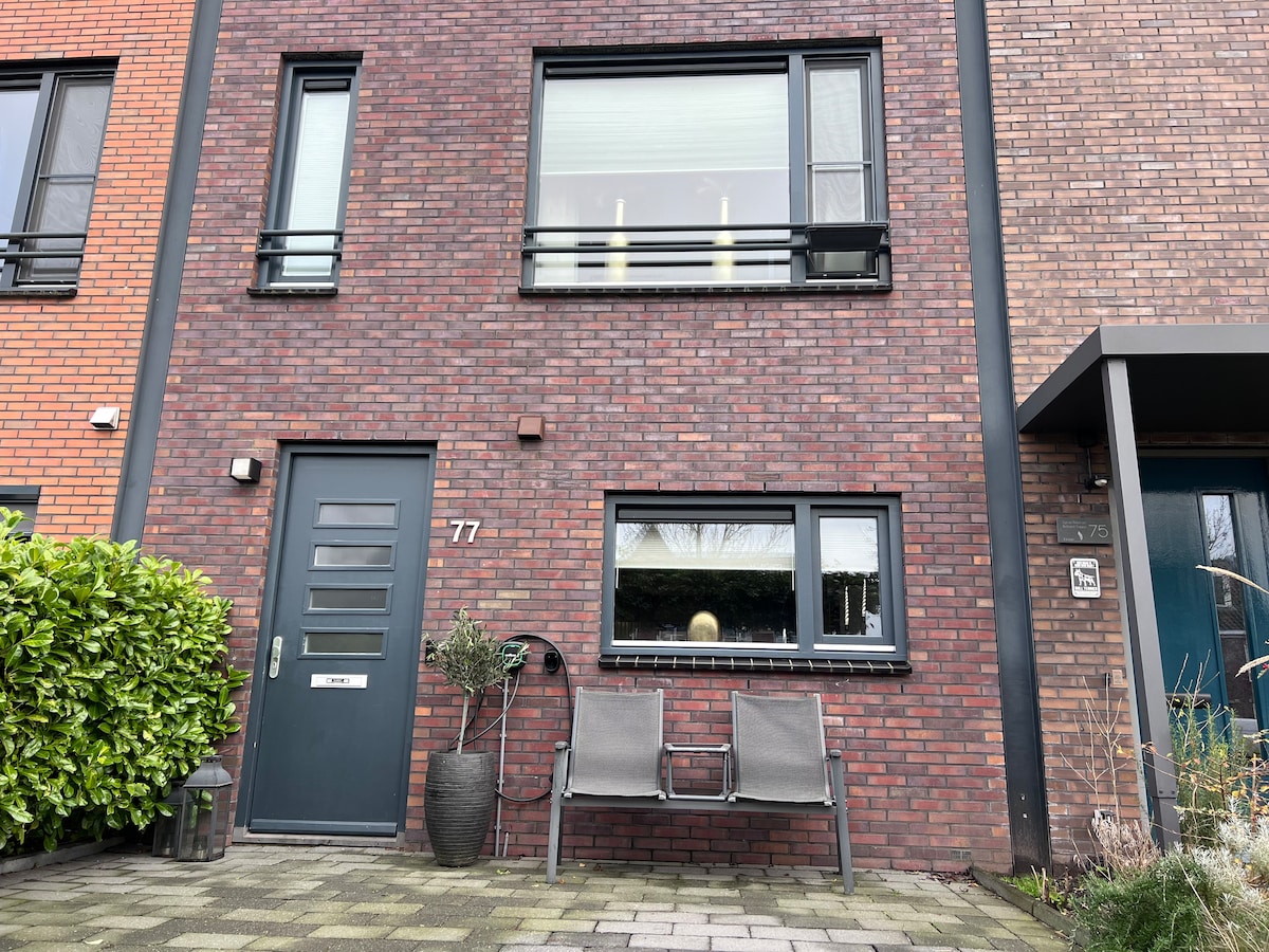 Esta encantadora y cómoda casa se encuentra cerca del centro de la ciudad y de un parque verde. Totalmente equipado; estacionamiento gratuito y uso gratuito de cuatro bicicletas... En 10 minutos puedes estar en el centro en bicicleta. Pero una vez más en el hogar experimentarás la paz y el espacio. La casa tiene tres amplios dormitorios y un balcón. 2 veces una cama doble y 1 cama individual. Una habitación con una cama de una plaza. También hay un escritorio con una pantalla de computadora.
