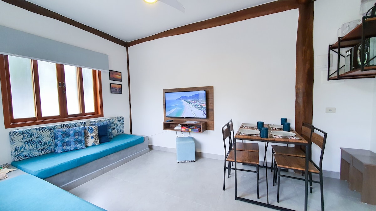Charmoso apartamento contendo uma suite, banheiro social, acomoda 2 pessoas, sala, cozinha tipo americana, varanda com churrasqueira, smart TV vivo, ventiladores de teto, Wifi, ar condicionado no quarto e sala, 1 quadra da praia, pertinho da área comercial de Maresias, dá para fazer tudo a pé. Local tranquilo e seguro.