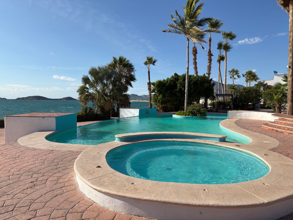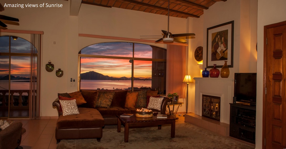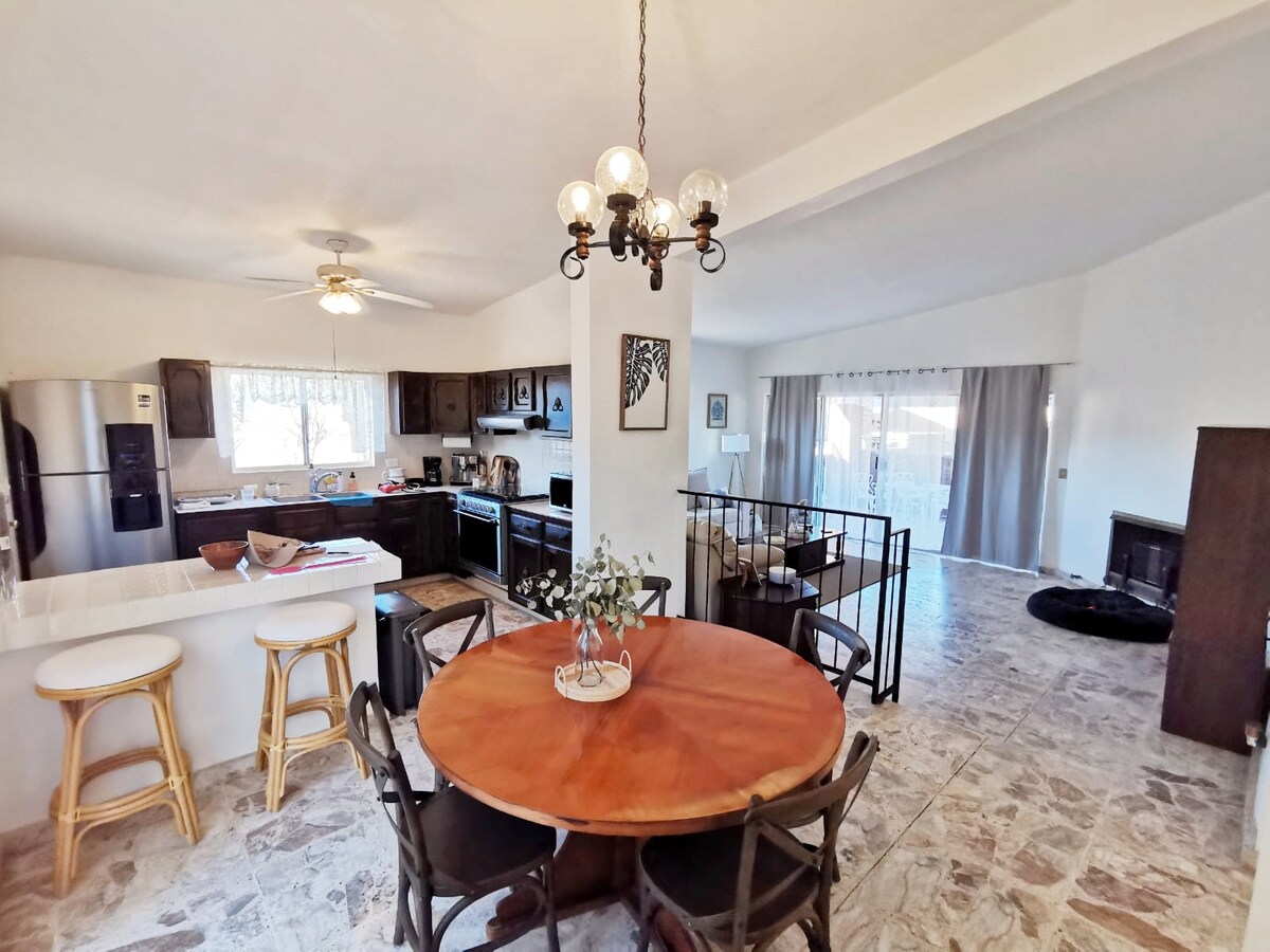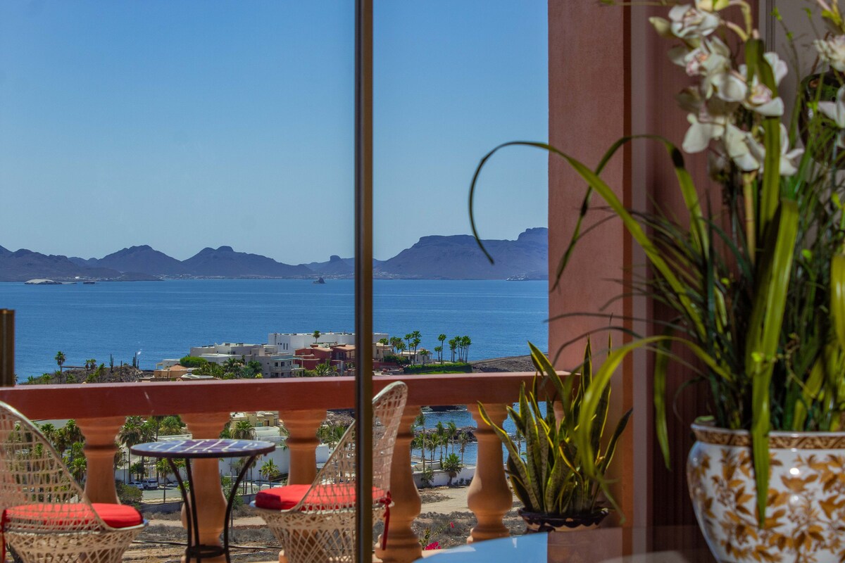 Vista del mar de Cortés, amanecer, puerto deportivo, ciudad. Cerca de tiendas, restaurantes y pubs locales. A pocos pasos del puerto deportivo y la playa de San Carlos. 4 dormitorios (una habitación pequeña con sofá cama), 3 baños completos, internet/wifi rápido y fiable de Starlink, sistema de purificación/ablandamiento de agua, aire acondicionado, calefacción, detectores de humo/monóxido de carbono, mesa de escritorio plegable, sistema de audio Bluetooth, PlayStation 3, cuna Pack 'N Play, silla alta. Cocina totalmente abastecida, murales/arte de estilo mexicano, fuente, balcón envolvente, limpio y acogedor.