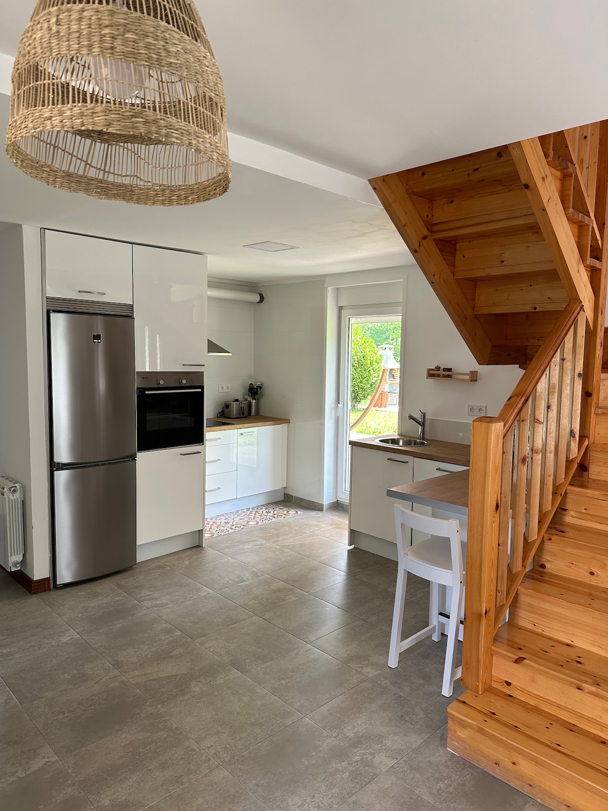 Vivienda exclusiva de 100m2. Espacio acogedor, cómodo e impecable con un interiorismo muy cuidado, optimizando la funcionalidad y la estética tanto en mobiliario como en materiales e iluminación. Dispone de grandes ventanales lo que permite la entrada de mucha luz natural y vistas panorámicas a la finca. Está equipada con todo lo necesario para seis huéspedes. Está rodeada de jardín de unos 300 m2 delimitados con un cierre de hayas en crecimiento y dotada de piscina con agua de manantial.