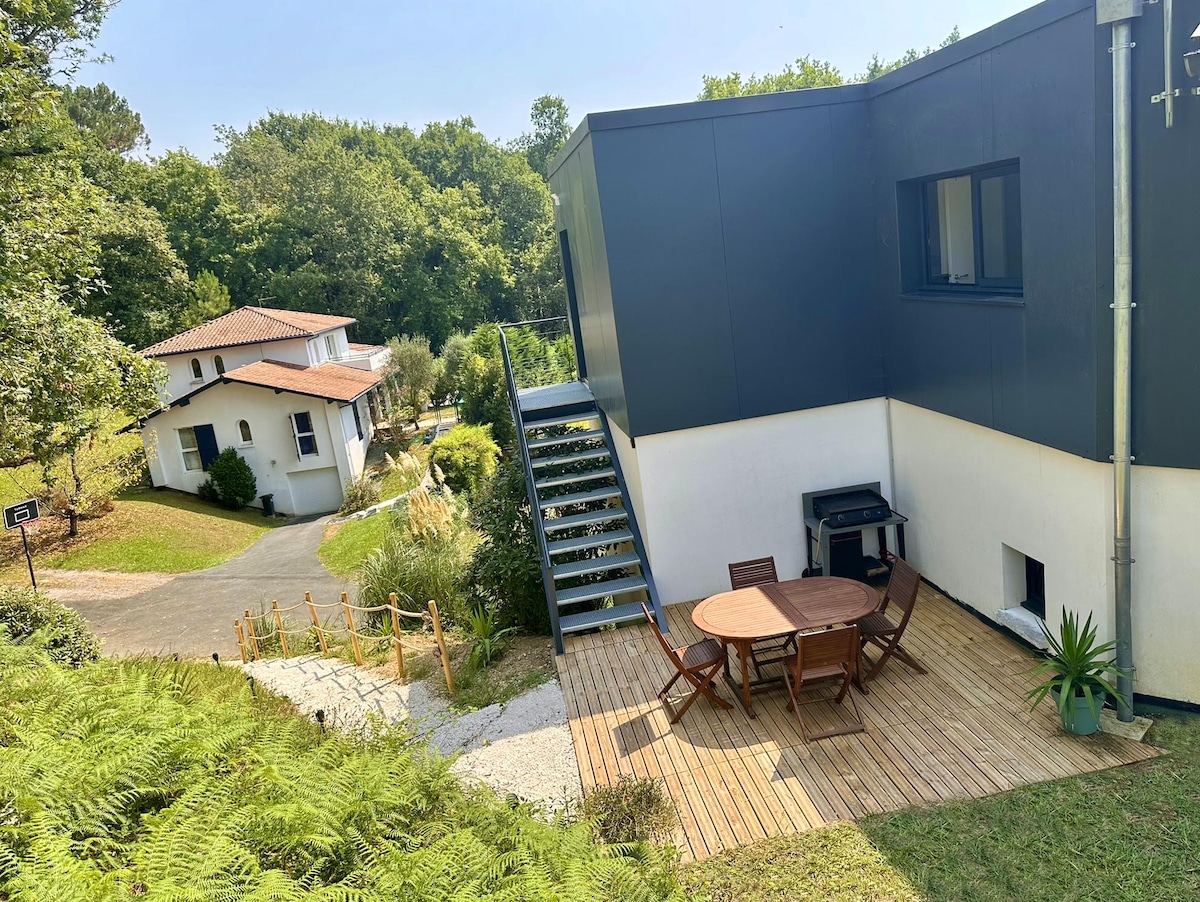 A 10 minutos del centro de Bayona y Biarritz , Jean e Isabelle estarán encantados de recibirle en la casa Millet antigua residencia que han restaurado. Situada entre el parque de Maharin y el bosque de pinos de Chiberta, las playas de Anglet estarán a 5 minutos en coche o a 20/25 minutos a pie y accesibles en bicicleta por el bosque. El alojamiento dúplex con jardín privado de 30 m² es una dependencia contigua a la casa de huéspedes. Fácil aparcamiento en la calle .
