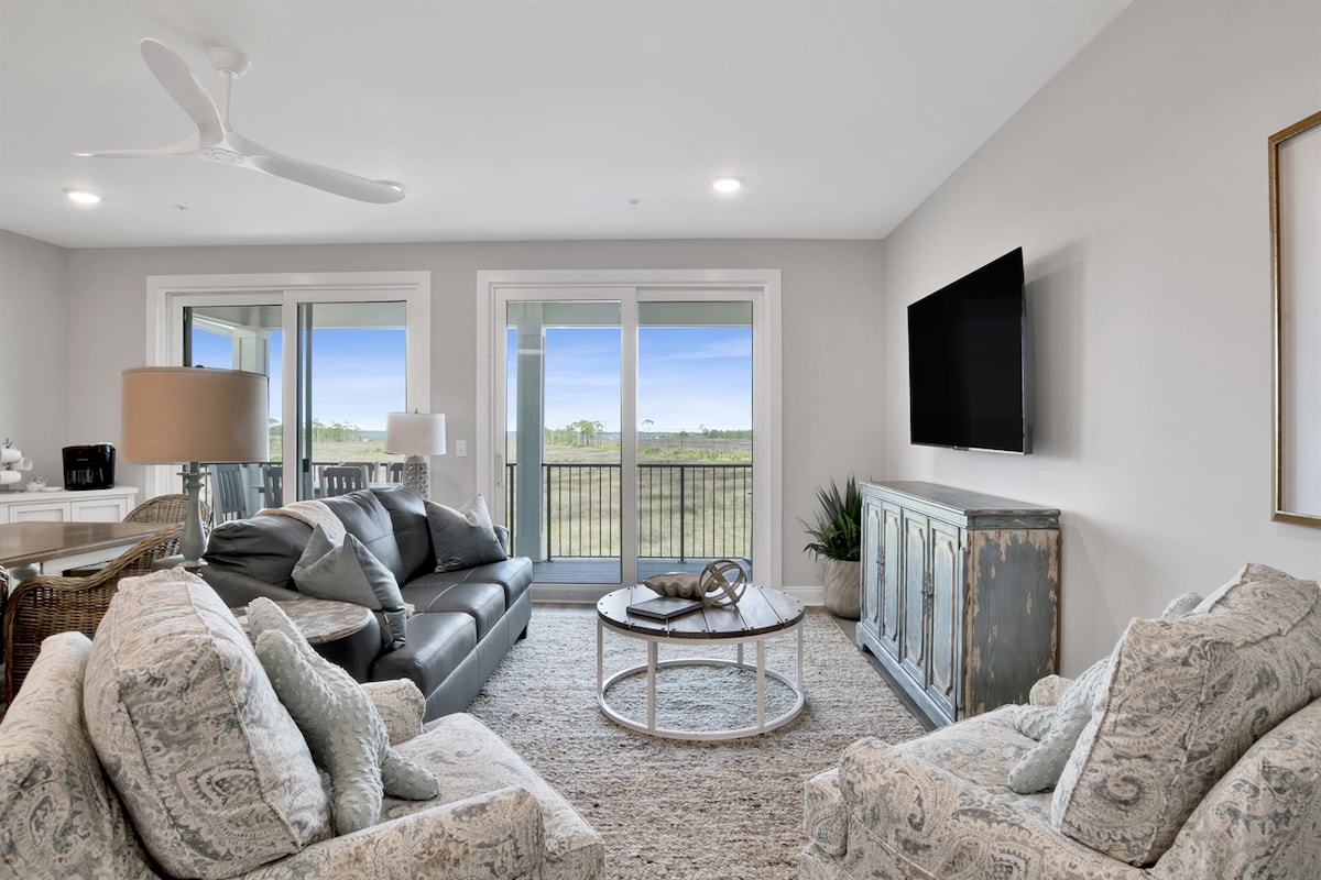 2 king bed suite condo with 3 private balconies providing amazing views of the Little Lagoon & the Gulf. 🌅 White sandy beaches of Gulf of Mexico are only a short walk via private deeded beach access located ~200 yards from the unit. Sunset Paradise is located in a low-density area where the beach is less crowded, yet only 3 miles from the heart of Gulf Shores. This best of both worlds location makes it a perfect spot for couples getaway or family vacation🏖️ ☀️ WATER VIEWS - BBQ - POOL - PIER