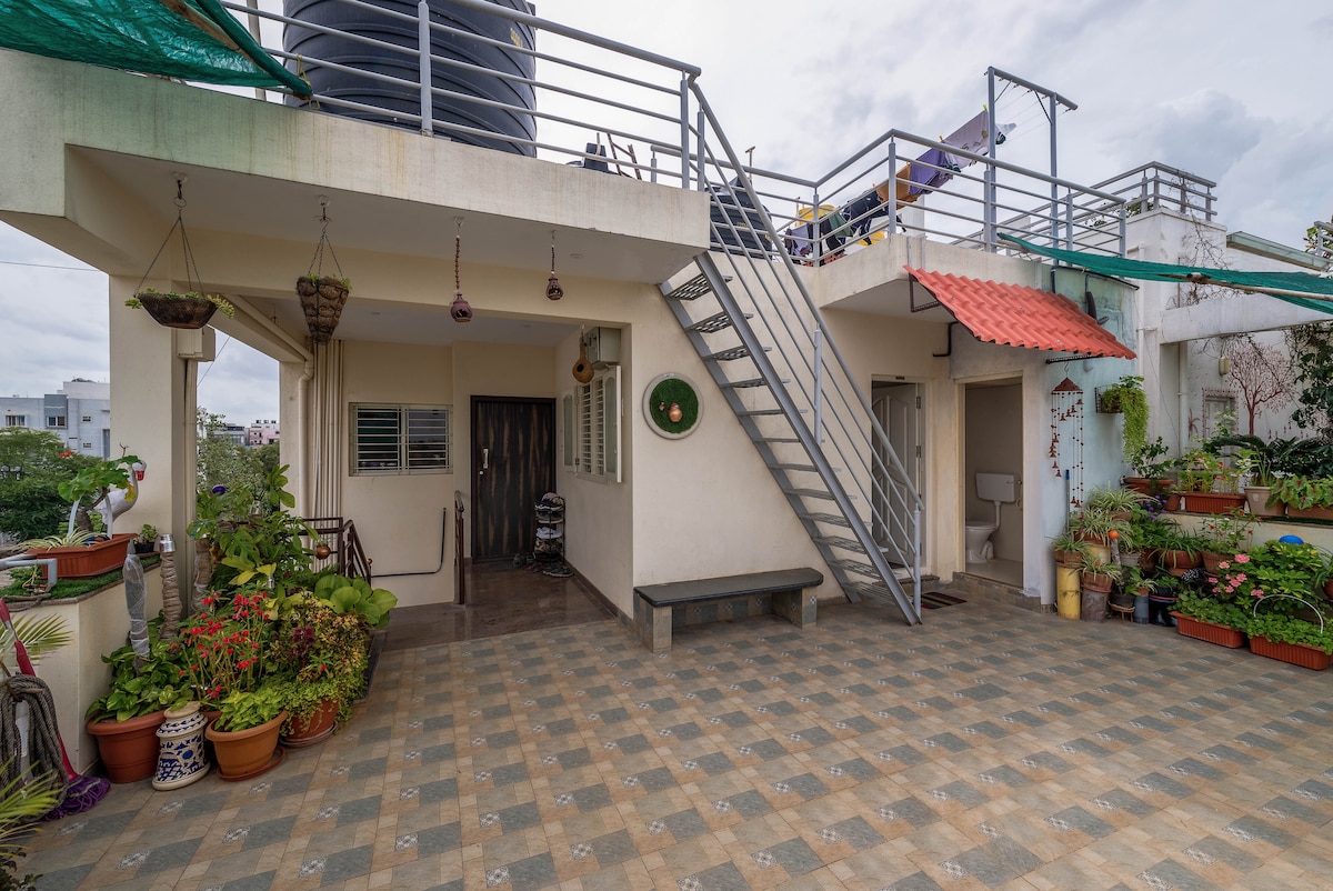 Stand alone studio on villa's terrace with an independent entry. Villa is part of a gated community and the host lives in the floors below, ensuring timely response for anything you need. Entire terrace floor is for guest's exclusive use. This includes a studio, sit-out deck and green terrace full of seasonal vegetables and flowers. 2/4 wheeler parking is available. Ideal for two adults or a couple with a young child. Extra guests can be accommodated on a floor mattress (chargeable)