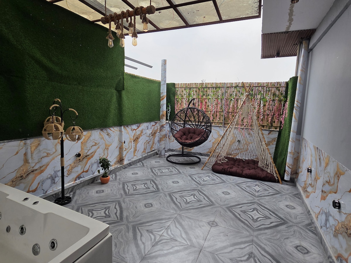 💘 A Space to Fall in Love All Over Again Warm Jacuzzi Glow — sink into bubbles, clink glasses, whisper dreams Private Terrace Nights — fairy lights, fresh air & stars as your witnesses Cozy King Bed — wake up wrapped in each other, not alarms Romantic Ambience — candles, soft lighting & soothing music vibes Perfect Privacy — just the two of you, no interruptions