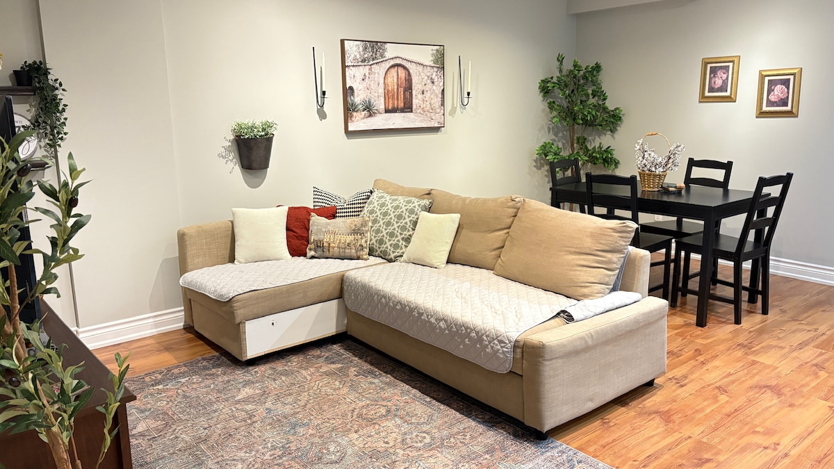 ¡Bienvenido a nuestro acogedor apartamento en el sótano! Este moderno Airbnb se encuentra en un barrio residencial tranquilo a 40 minutos en coche del centro de Toronto y a una hora de las cataratas del Niágara. El espacio bien iluminado cuenta con una cómoda cama tamaño queen, amplio espacio de almacenamiento en el espacioso armario y un interior bellamente diseñado con luz natural que inunda a través de grandes ventanales. Nota: Tenemos 2 colchones plegables individuales disponibles para colocar en el suelo del salón. Se proporcionan sábanas y almohadas adicionales.
