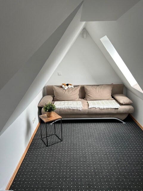 Die gemütliche 70qm große Wohnung befindet sich im Obergeschoß in unserem Einfamilien-Haus mit eigenem Aufgang u. Terrasse. Das Schlafzimmer hat ein 160cm breites Doppelbett m. Nachtschränke, Schrank und Fernseher. Das Wohnzimmer ist mit Eck-Couch, ein 120cm Bett, Schrank, Fernseher versehen. Vom Wohnzimmer geht eine Raumspartreppe (Achtung ohne Geländer!) in den Spitzboden. Dort können 3 weitere Personen übernachten. Die Küche ist für 6 Personen voll ausgestattet (mit Spülmaschine).