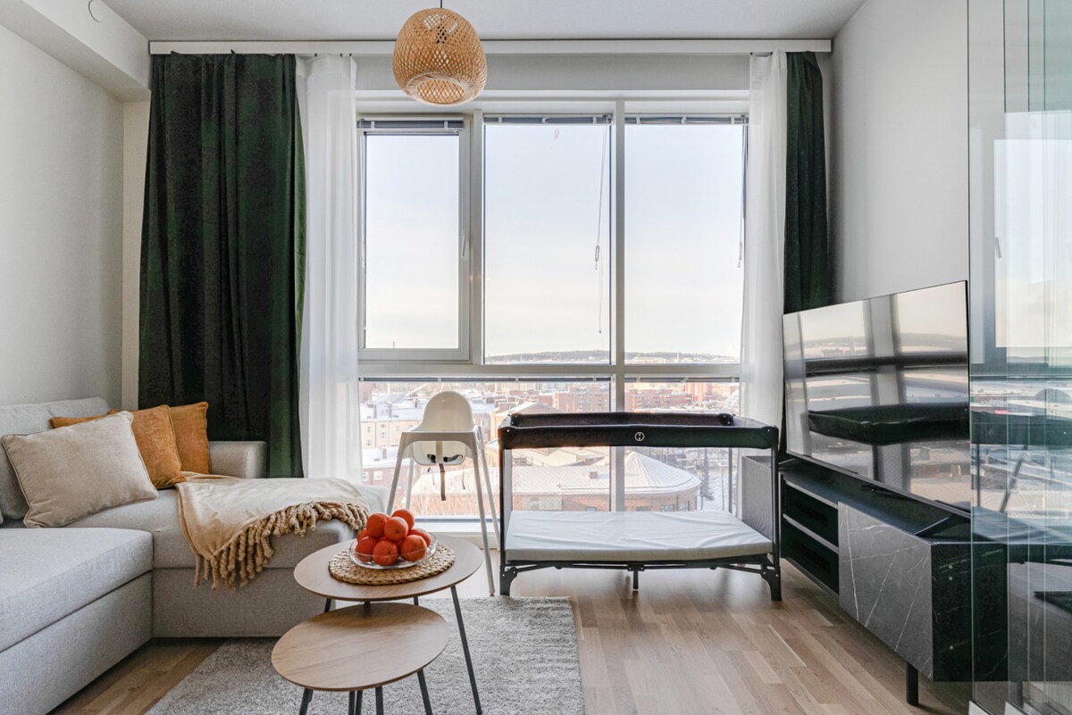 Enjoy a relaxing stay in the heart of Tampere! This spacious 8th floor studio offers you peace and quiet, above the noises of the city. A comfortable double bed as well as a sofa bed that opens into a double bed make this apartment suited for couples and families alike! There's a portable air conditioner, a large bathroom with a washing machine and a large glazed balcony with beautiful views of the city center. This spacious studio is located just a 10-minute walk from the train station.