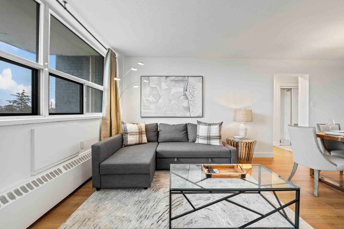 Moderno y chic con mucha iluminación natural + estacionamiento subterráneo gratuito + estaciones de vehículos eléctricos **Ventajas: escritorio de pie, lavandería privada, café y té de cortesía y check-in sin contacto ** A 1 minuto de QEW, conectado a Go Station, a 10 minutos a pie del centro de la ciudad, a 1 minuto a pie de la tienda de comestibles. Cancha de baloncesto, gimnasio, sala de teatro, salas de fiestas, sala de juegos para niños, gimnasio al aire libre, barbacoas, área de descanso en el patio, Sky Lounge, sauna, estaciones de lavado de perros, seguridad 24/7. Construcción en curso en la zona. Opera durante el horario comercial