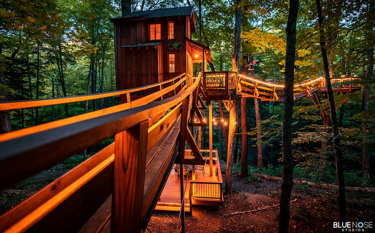Tus anfitriones, Tom y Lisa Wallace, están encantados de recibirte en The Chez' Tree Rest Treehouse, nuestra casa del árbol de 2 pisos perfectamente situada bajo una ladera pintoresca con mucho follaje, a 35 pies sobre el suelo del bosque, en 2 imponentes árboles de arce. Mientras caminas hacia la casa del árbol a través del puente de cable de 60 pies, sentirás que el estrés y las preocupaciones de la vida cotidiana se desvanecen. La casa del árbol es de 150 pies cuadrados de pura magia y el lugar perfecto para una escapada romántica en lo alto de los árboles.