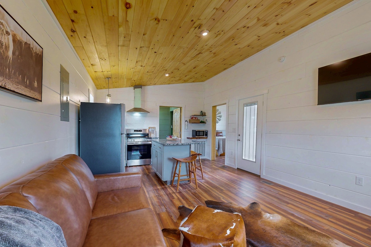 Increíble casa pequeña situada en 23 acres muy privados, convenientemente ubicada justo al lado de la carretera principal. Recién construido en 2023, este moderno estudio ofrece una enorme cantidad de servicios que incluyen cocina completa, duchas dobles, jacuzzi, TV al aire libre, wifi de alta velocidad, múltiples servicios de visualización de TV, comedor al aire libre, parrilla, múltiples características de fuego, vistas a la montaña, mucho espacio para caminatas cortas o paseos por la naturaleza, área con vistas al atardecer a poca distancia de la casa, a solo 1,5 millas del parque frente al río.
