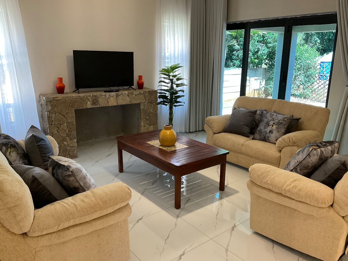 Precioso apartamento con servicios de 2 dormitorios con jardín privado, terraza cerrada, amplio salón, cocina moderna con placas de gas y eléctricas, lavadora, nevera, tostadora, hervidor eléctrico, agua caliente, agua de respaldo y energía en un complejo seguro. Los huéspedes podrán acceder a wifi sin tapa y a la televisión por satélite. Los dormitorios están equipados con una cama tamaño king y queen, respectivamente.
