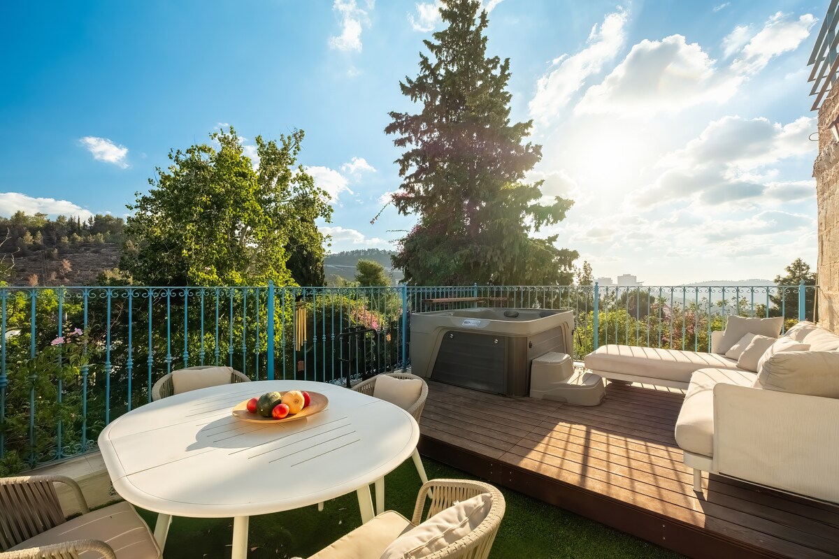 Hermoso y lujoso apartamento de 3 habitaciones en una villa en Jerusalén con una entrada independiente, para 6 inquilinos, la unidad de vacaciones con jacuzzi en el patio. Y una piscina en un gran patio abierto, hermosa, lujosa y climatizada durante las estaciones de transición. El apartamento está totalmente equipado, cerca del centro comercial y de un centro comercial del vecindario, el transporte público está disponible para todas las partes de la ciudad y el estacionamiento está disponible frente a la casa de forma gratuita y disfruta con toda la familia en el lugar.