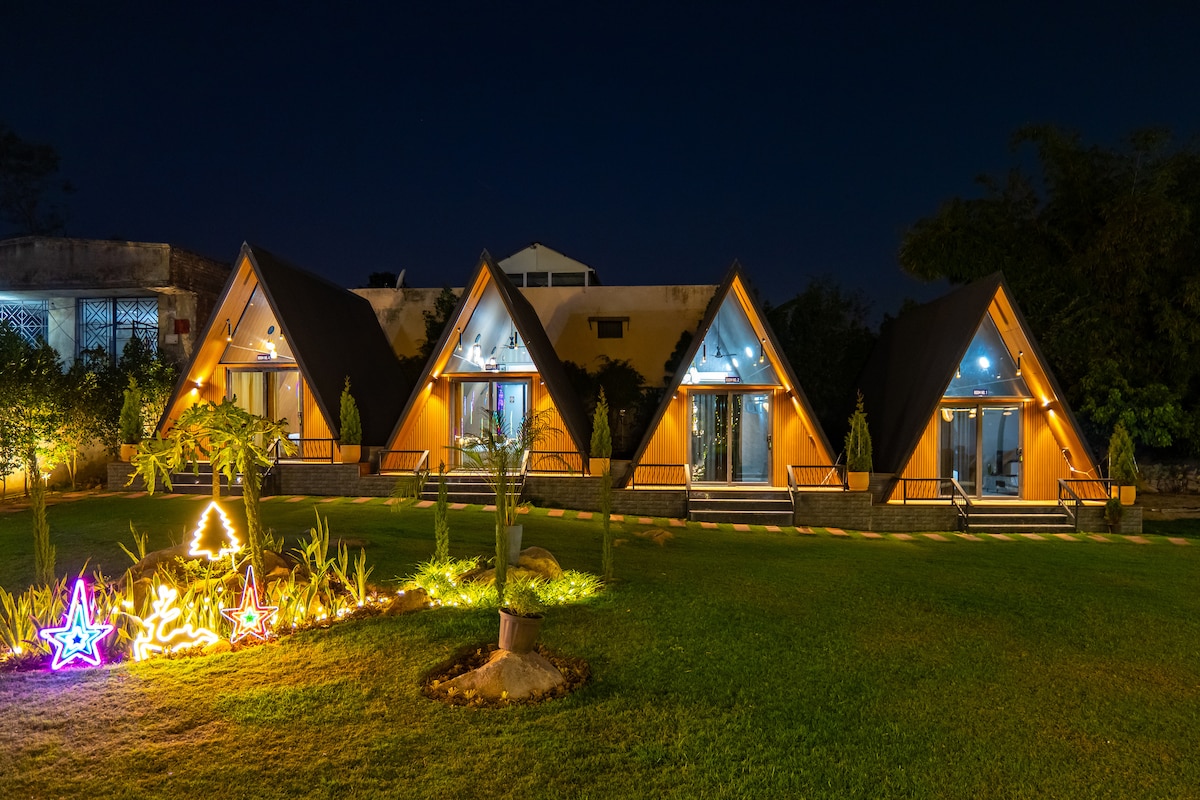 Tucked in a peaceful forest resort near Mini Ladakh, this charming cottage offers a serene retreat with modern wooden interiors & vaulted ceilings It opens to a private balcony with scenic views of the lush garden & pool, ensuring complete relaxation The resort offers an unparalleled experience with a shared pool & gazebo, a state-of-the-art gym, & a multi-cuisine restaurant Guests can unwind in the sauna, challenge themselves in the game zone, or lose themselves in a book at the serene library
