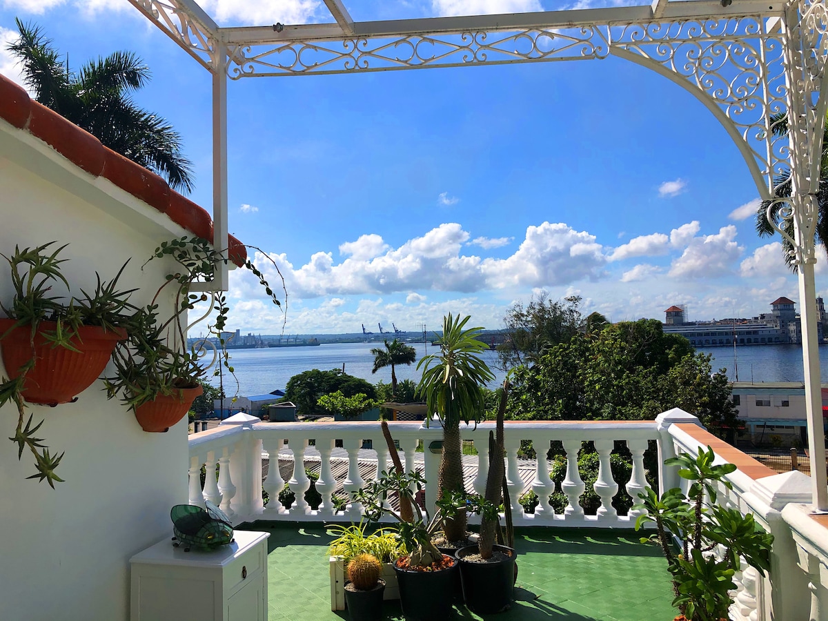 Despierta con vistas espectaculares a la Bahía de La Habana desde tu terraza.Rodeado de vegetación, este apartamento ofrece un jardín con plantas exóticas y espejo de agua, dormitorio con baño privado, pantry, desayuno tropical incluido y WiFi disponible. A solo 5 min en ferry del Centro Histórico y unos minutos de la estatua del Cristo y fortaleza.Siempre hay fluido eléctrico en nuestra zona. Un lugar para relajarte y disfrutar lo mejor de La Habana auténtica.